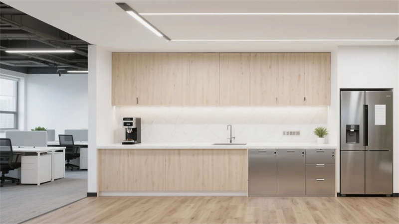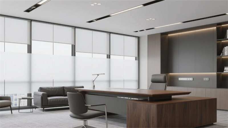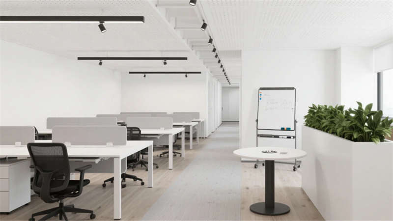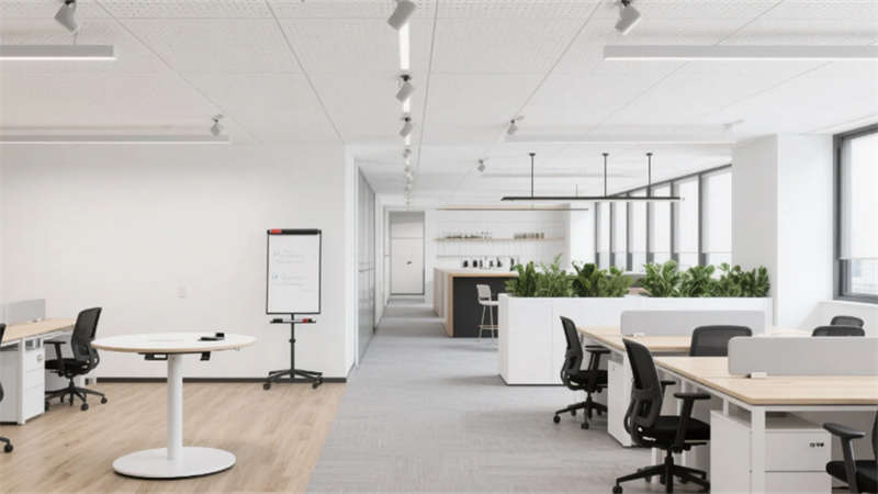 室內(nèi)空間延續(xù)外立面設(shè)計(jì)語(yǔ)言,企業(yè)大堂通過(guò)技術(shù)創(chuàng)新實(shí)現(xiàn)淺白大理石與木紋墻面的無(wú)縫拼接,懸浮式線性燈光系統(tǒng)可隨自然光線智能調(diào)節(jié)色溫。開(kāi)放式辦公區(qū)配置智慧化模塊組合,可升降桌體與軌道射燈靈活適配多元場(chǎng)景,協(xié)作島集成無(wú)線充電與環(huán)境感知功能。高管辦公室采用智能霧化玻璃隔斷,實(shí)現(xiàn)隱私與通透的自由切換。科技會(huì)議室搭載高清透明顯示系統(tǒng)與多聲道聲學(xué)設(shè)備,電動(dòng)百葉簾與補(bǔ)光系統(tǒng)聯(lián)動(dòng)打造智能會(huì)議環(huán)境。