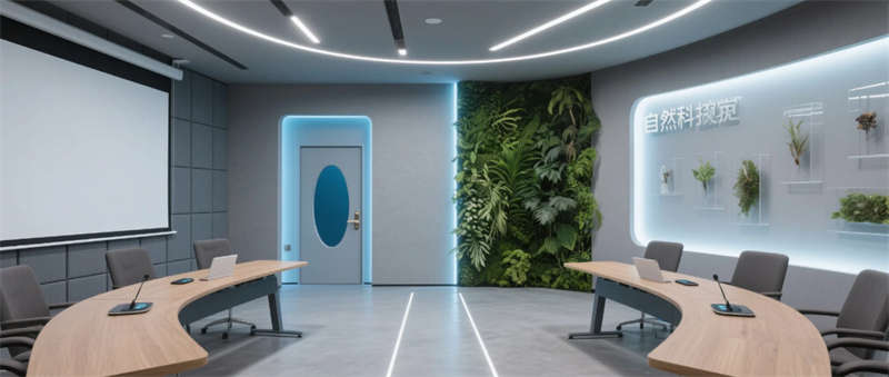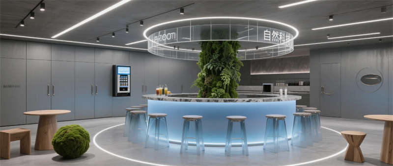各區(qū)域通過四大統(tǒng)一性語言緊密串聯(lián):霧霾藍(lán)橢圓金屬門把手貫穿全空間,再生材料家具呼應(yīng)可持續(xù)發(fā)展理念,聲學(xué)墻面嵌入本地植物標(biāo)本強(qiáng)化生態(tài)屬性,智能燈光系統(tǒng)則通過4000K色溫線性燈帶實現(xiàn)晝夜場景的無縫切換。特別設(shè)計的全息投影展廳與智能階梯會議室,通過LED交互地屏與AR懸浮展臺,將品牌科技基因融入空間體驗。