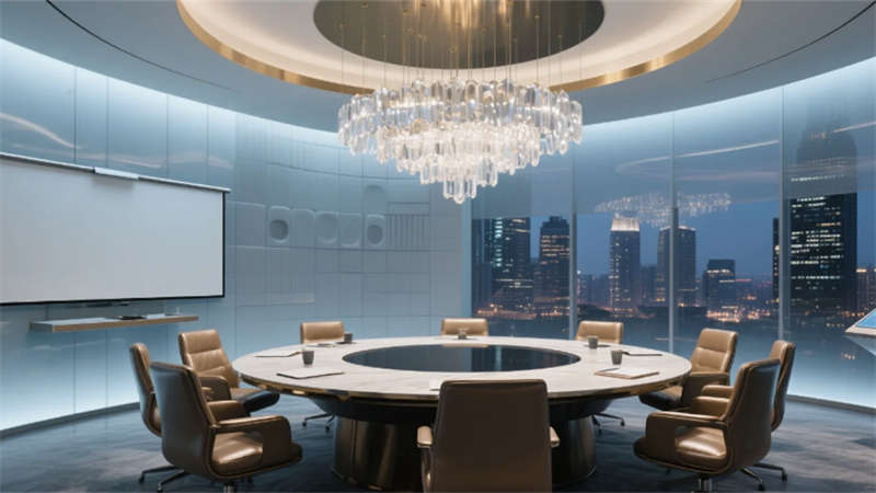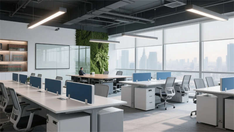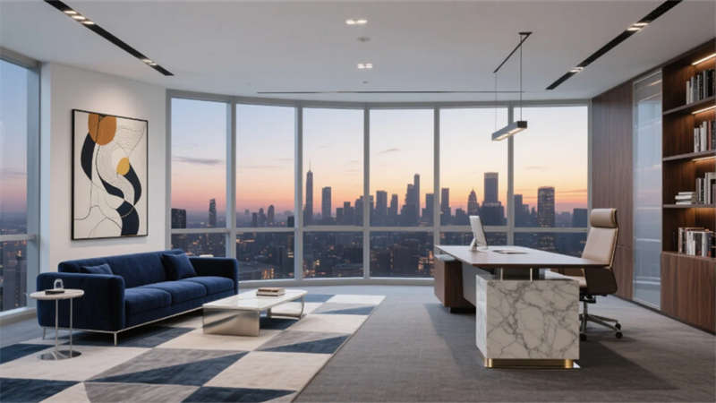 入口處弧形接待臺似律法天平,發(fā)光企業(yè)標識懸浮于透光大理石背景墻,線性燈光如正義之軌延伸至開放式辦公區(qū)。玻璃幕墻外合肥城市天際線成為動態(tài)畫布,智能升降桌與模塊化工位詮釋高效協(xié)作。合伙人辦公室的270°環(huán)景視野,將巢湖煙波與都市繁華收于案頭,霧化玻璃在私密與開放間自由切換。