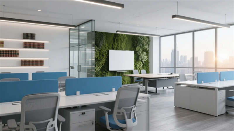 模擬法庭的深藍吸音墻面沉淀莊重氣質,可升降投影幕布與電子證據(jù)墻構建數(shù)字化思辨場域;休閑區(qū)綠植幕墻與暖光閱讀角,則讓理性思考在自然光影中得以舒緩。從智能檔案庫的藍色光帶導航,到洽談室聲學波浪頂棚,科技元素始終隱于優(yōu)雅形態(tài)之下。