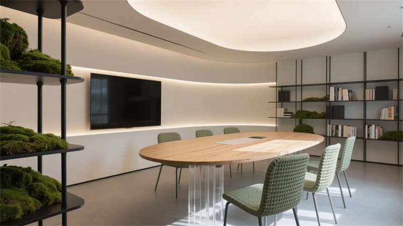 智能接待廳以流動(dòng)數(shù)字藝術(shù)傳遞先鋒調(diào)性,而健康茶水間則通過有機(jī)材質(zhì)與綠植裝置,構(gòu)建松弛有度的能量補(bǔ)給站。整體空間拒絕刻板分割,家具模塊可隨需求自由重組,金屬線條與低飽和色彩在自然光照下沉淀出理性而溫潤(rùn)的質(zhì)感。