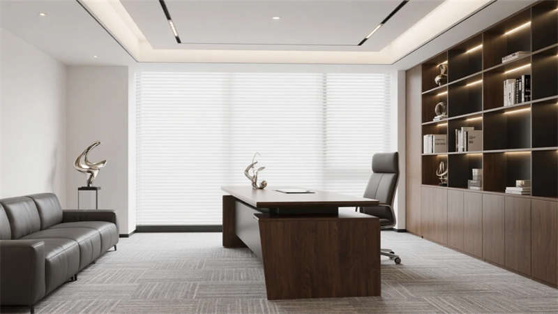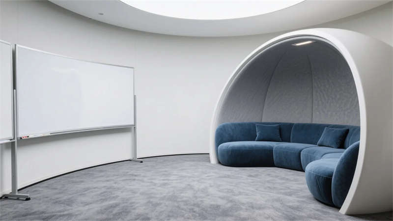 核心區(qū)域聚焦功能與美學(xué)的平衡:前臺木格柵墻以線性燈光延展空間縱深感;開放式工位區(qū)通過綠植與幾何畫作注入生機;獨立辦公室運用胡桃木與皮質(zhì)元素提升質(zhì)感,整墻書架成為智慧沉淀的象征。過渡空間被賦予多重價值——走廊生態(tài)墻引入自然呼吸,蛋形討論艙激發(fā)即興靈感,階梯圖書館則營造沉思角落。