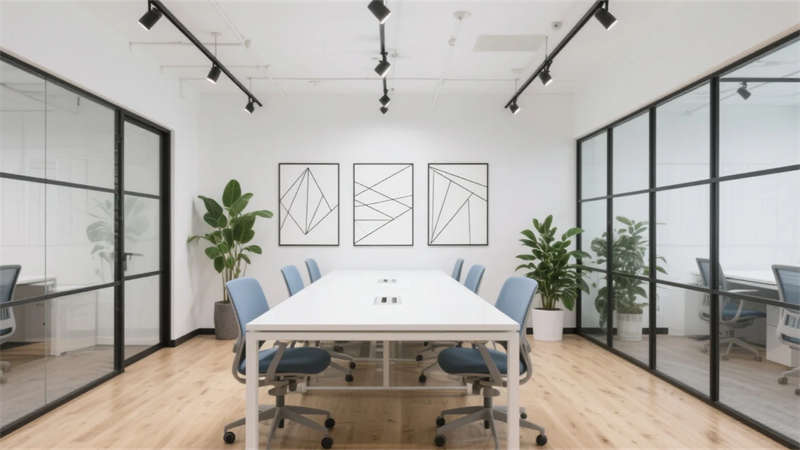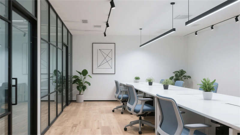該辦公空間以現(xiàn)代簡約主義為基調(diào),摒棄冗余裝飾,通過材質(zhì)本真與光影韻律構(gòu)建理性而溫潤的場域。開放式布局打破傳統(tǒng)隔閡,淺木色地板與純白立面奠定寧靜氛圍,黑色金屬框架勾勒結(jié)構(gòu)張力,形成流動的視覺節(jié)奏。