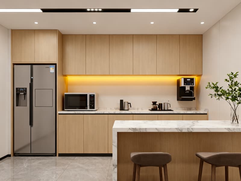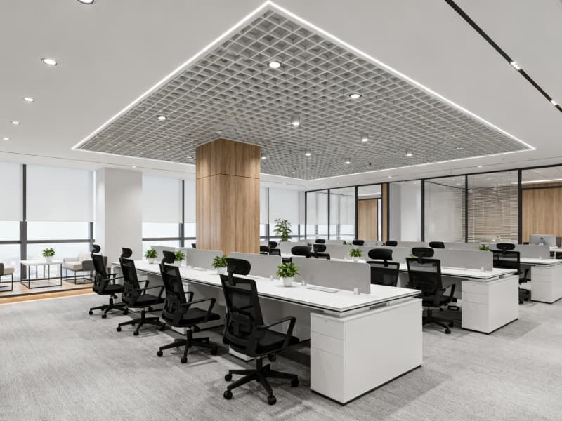 空間布局上,科學(xué)劃分接待區(qū)、開放辦公區(qū)、獨立辦公室、會議室、茶水間等功能區(qū)域,優(yōu)化動線設(shè)計,保證辦公流程順暢。開放辦公區(qū)注重靈活性與協(xié)作性,模塊化家具與可移動隔斷適配不同工作場景;獨立辦公室與會議室強(qiáng)調(diào)私密性與專業(yè)性,通過材質(zhì)與燈光營造專注氛圍;休閑茶水間與休息區(qū)則注重放松感,自然元素的融入緩解工作壓力,平衡工作與休息。