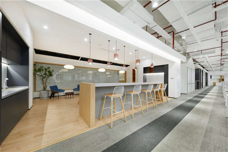 工位數(shù)量需求雖然龐大,但甲方對多元化的功能區(qū)的需求并未減少。于是我們將咖啡吧、茶水間、休閑區(qū)這幾個功能進(jìn)行融合,破除了空間的界定,將水吧區(qū)打造成一個開放性的多功能區(qū)域,賦予它全新定義,從而達(dá)到滿足員工的一系列休閑目的。
