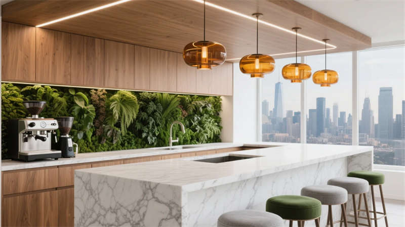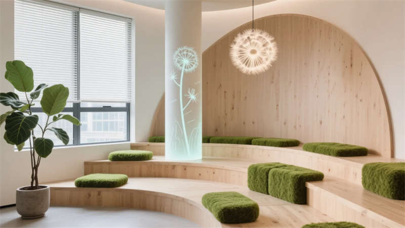 這座辦公空間以「自然共生」為脈絡(luò),將科技智能隱于溫潤(rùn)質(zhì)感之中。入口處生態(tài)前臺(tái)以洞石與苔蘚破界對(duì)話,定調(diào)空間的生命力;開放協(xié)作區(qū)如流動(dòng)的創(chuàng)意河谷,模塊家具隨需求自由重組,綠植隔斷悄然凈化空氣;散落的靜音艙與冥想穹頂,為深度思考提供呼吸間隙。
