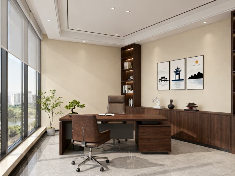 本設(shè)計以滿足辦公功能需求為核心,融合現(xiàn)代簡約風(fēng)格與蚌埠地域文化元素,打造兼具實用性與美觀性的辦公空間。整體空間色彩以淺色系為主,搭配深色點綴,營造清爽、舒適的視覺效果,同時通過落地玻璃窗、線性吊燈等設(shè)計引入充足光線,減少空間壓抑感。?