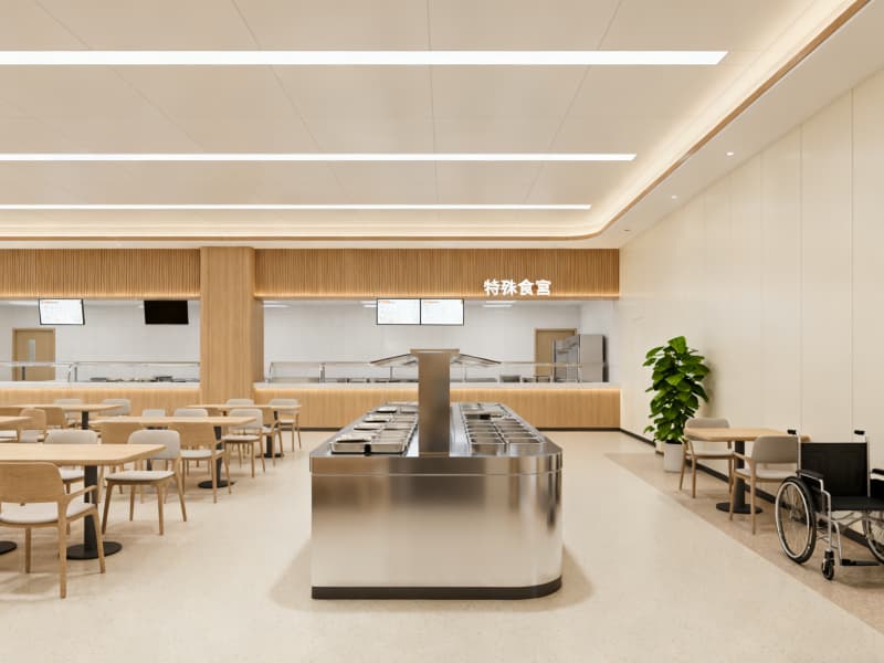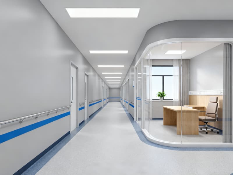 同時,通過三大核心設(shè)計傳遞療愈感:①色調(diào)上以米白、淺灰、原木色為主,搭配藍色點綴,避免冰冷刺激;②材質(zhì)上選用醫(yī)用級環(huán)保、防污、防滑材料,兼顧安全與舒適;③元素上融入自然綠植、柔和燈光、圓角設(shè)計等,緩解患者就醫(yī)焦慮。?