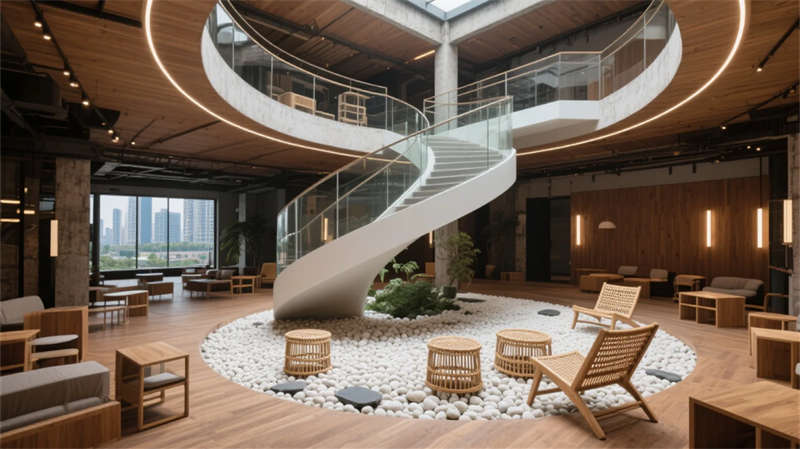 開(kāi)放式核心區(qū)采用模塊化家具系統(tǒng),配合智能照明與聲學(xué)優(yōu)化,兼顧協(xié)作效率與專注需求;階梯沙龍與透明會(huì)議盒子激發(fā)即興創(chuàng)新,可移動(dòng)隔斷實(shí)現(xiàn)場(chǎng)景自由切換。最具特色的是貫穿三層的垂直生態(tài)中庭,旋轉(zhuǎn)樓梯纏繞常綠藤蔓,成為連接空間的活力紐帶。