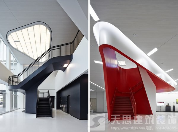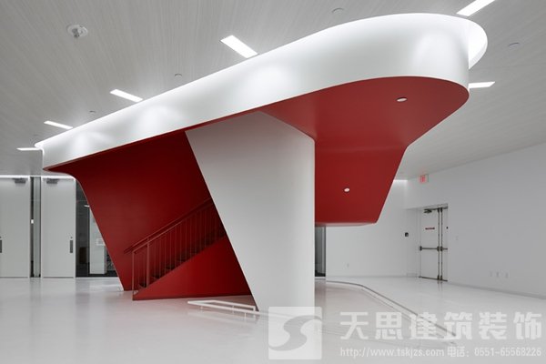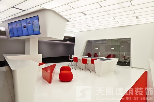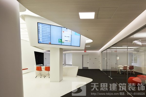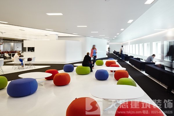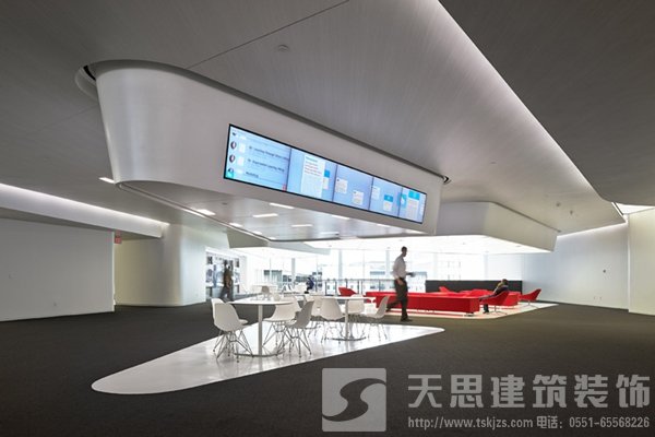 綜合大樓過渡區(qū)設(shè)計(jì)為開放式合作工作區(qū)域,傳統(tǒng)的理念通常認(rèn)為這里和工作場所相比不是那么有用,但是很多富有成效的非正式的討論往往在這里誕生。每個(gè)工作中心都配有色彩鮮明的家具,頂部下方挑檐底面突出的吊頂造型內(nèi)嵌LED顯示屏,不斷滾動(dòng)播出最新信息,包括各種通知、員工和訪客新聞、各種公告、新聞事件以及全球3M公司員工信息。