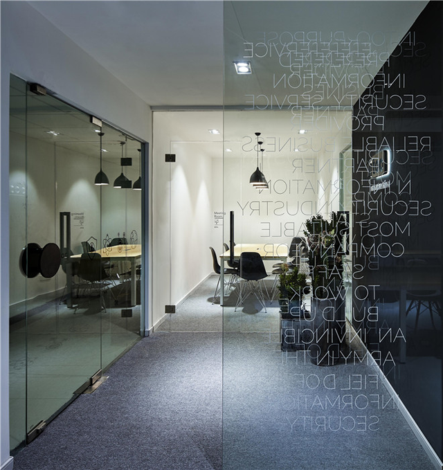 業(yè)主希望突出公司的科技感,主要就以黑白為主,玻璃上的裝飾采用正反拼貼,營(yíng)造出慢慢消印的代碼的科技感。為了節(jié)省造價(jià),空間使用常規(guī)建材乳膠漆、地毯、地平漆。