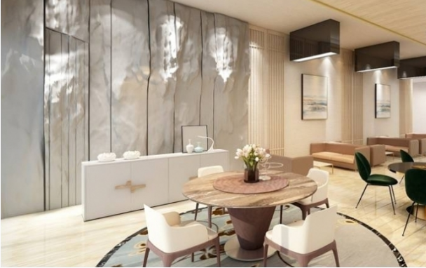 淺灰色的運(yùn)用集中在待客區(qū)的沙發(fā)色和吊燈以及墻壁上點(diǎn)綴的元素,同一色系的運(yùn)用分散在整個(gè)空間中,既不在局部上造成較大的色塊沖擊,表現(xiàn)溫和;又能夠在整體上體現(xiàn)呼應(yīng)的設(shè)計(jì)原則。