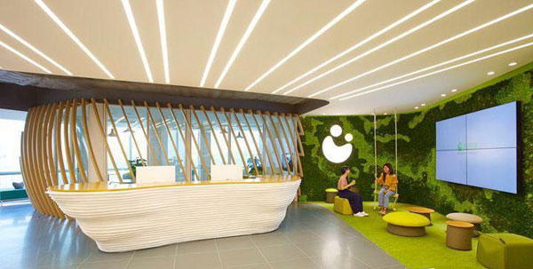 木制材質(zhì)頂板加上錯綜非規(guī)則紋路的前臺造型,再搭配綠色樹林墻身、秋千以及俏皮創(chuàng)意的蘑菇凳,讓前臺充滿了既視感。這不再是一個(gè)單純的辦公室,而是一個(gè)可以自由舒適徜徉其中的樂園。