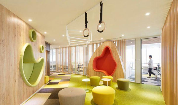 在樹屋的另一側(cè)設(shè)計(jì)著吊杠和造型樹洞,以及擺放活潑多樣的休閑家私,增添了工作或者閑暇溝通中的樂趣和互動性更讓員工在輕松辦公的同時(shí)有拉伸小鍛煉的機(jī)會