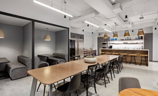 大型咖啡館和食品儲藏室是為協作而設計的,是辦公室的公共中心。一張長長的餐桌、展位、座位和休息區(qū)為非正式會議、社交聚會的地方。