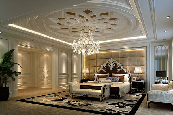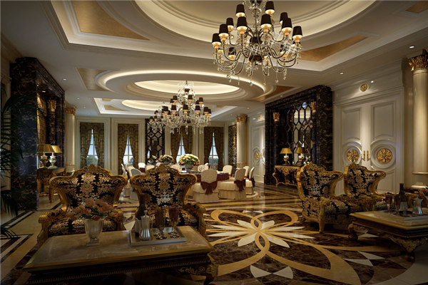 玄關(guān)、大堂、客廳都選用具有歐式風(fēng)格的水晶吊燈、羅馬柱和花崗巖地磚,客廳桌椅則選用搭配經(jīng)典歐式的茶幾。