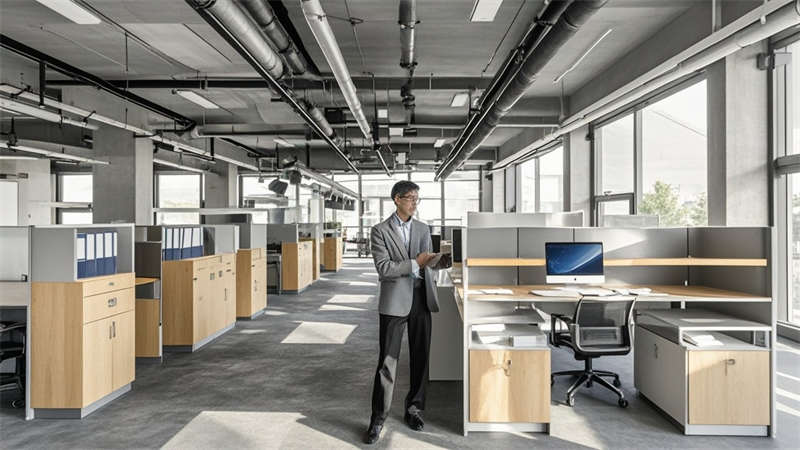 本1500㎡現(xiàn)代簡約辦公室設(shè)計(jì)以'高效協(xié)作·人文關(guān)懷'為核心,采用模塊化空間布局提升使用彈性。主色調(diào)選用淺灰、白、木三色系,局部點(diǎn)綴企業(yè)深藍(lán)色強(qiáng)化品牌認(rèn)知。開放式辦公區(qū)采用1.2m×1.8m標(biāo)準(zhǔn)工位模塊,通過玻璃隔斷實(shí)現(xiàn)90%自然光滲透率。智能照明系統(tǒng)根據(jù)日照強(qiáng)度自動(dòng)調(diào)節(jié)色溫,全年節(jié)電率達(dá)35%。核心筒改造區(qū)運(yùn)用曲面木飾面弱化建筑結(jié)構(gòu),形成自然交流節(jié)點(diǎn)。聲學(xué)設(shè)計(jì)方面,蜂窩吸音板(NRC 0.85)與隔音艙(STC 52)組合控制噪音污染。茶水區(qū)采用磁吸軌道插座系統(tǒng),支持設(shè)備靈活接入。所有家具均符合WELL建筑標(biāo)準(zhǔn),辦公椅配備6向調(diào)節(jié)功能。通過BIM技術(shù)實(shí)現(xiàn)管線綜合,保留3.2米凈高營造開闊感。