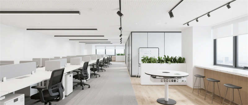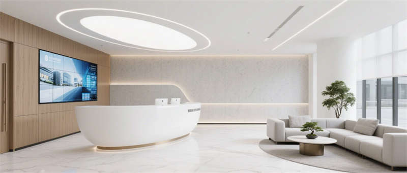 步入企業(yè)大堂,淺白大理石與溫潤木紋墻面形成材質(zhì)對話,懸浮式線性燈光如時空隧道貫穿空間。深藍色企業(yè)LOGO在弧形純白前臺形成視覺錨點,數(shù)字影像墻實時跳動的數(shù)據(jù)流與模塊化沙發(fā)區(qū)的綠植盆景構(gòu)成動與靜的平衡。辦公區(qū)采用模塊化升降系統(tǒng),穿孔吸音天花與協(xié)作島構(gòu)成靈活辦公矩陣,落地窗邊的高吧臺休憩區(qū)借綠植隔斷營造都市綠洲意境。