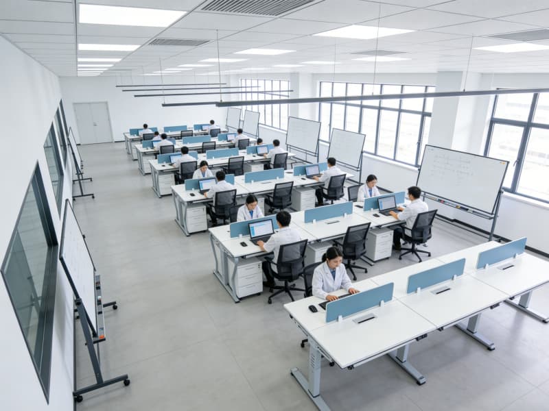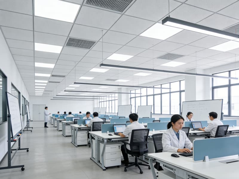 研發(fā)區(qū)營造舒適且富有創(chuàng)意的氛圍。開放式的辦公區(qū)域配備智能升降辦公桌與可移動白板,方便團隊交流與頭腦風(fēng)暴。實驗室采用模塊化設(shè)計,實驗臺布局合理,各類先進儀器有序擺放。通風(fēng)系統(tǒng)保證實驗環(huán)境安全,同時設(shè)置綠植墻,為科研人員舒緩壓力。