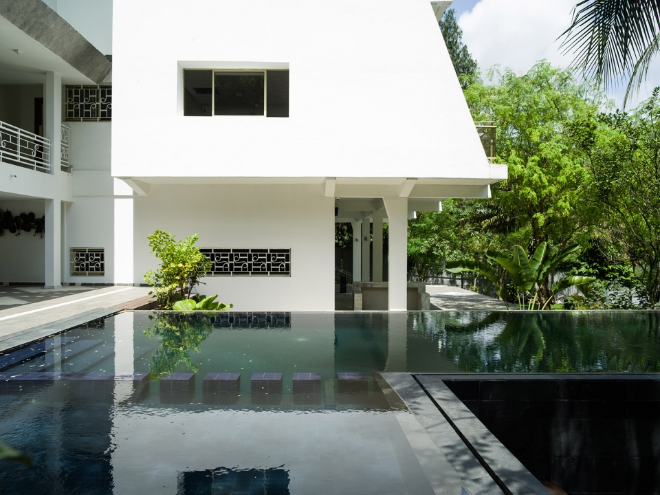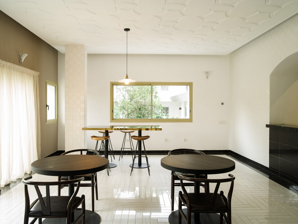 酒店外觀局部,建筑在泳池中投下倒影,部分外部視圖,池反射建筑物。健身房和養(yǎng)生區(qū)位于原建筑的廚房處,擁有良好的自然通風(fēng)以及朝向。游泳池又長(zhǎng)又窄,客人們可以在其中進(jìn)行來回往復(fù)式的游泳運(yùn)動(dòng),同時(shí)還在炎炎夏日里為客人們提供了一個(gè)消暑空間,當(dāng)?shù)貥淠镜娜~子和開花植物則為泳池空間提供了遮陰處和裝飾。