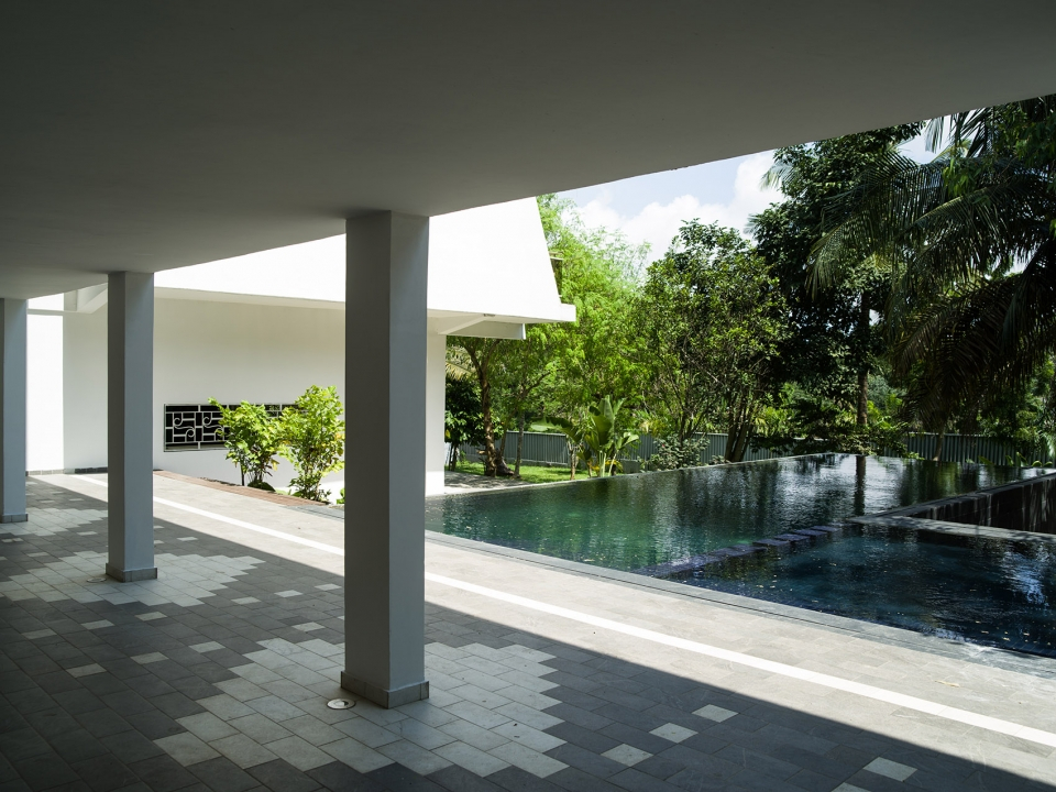 站在走廊上看泳池,室外狹長(zhǎng)的泳池,棕櫚樹蔭提供了遮陽空間?;▓@也充滿了自然的意趣,給人一種放松之感,建筑師還在花園的地面上鋪設(shè)了新的灰白兩色圖案的地板,不僅在室外空間中創(chuàng)造了一種視覺聯(lián)系,更是將室外空間統(tǒng)一了起來。