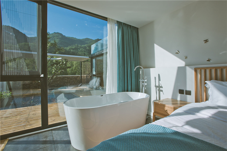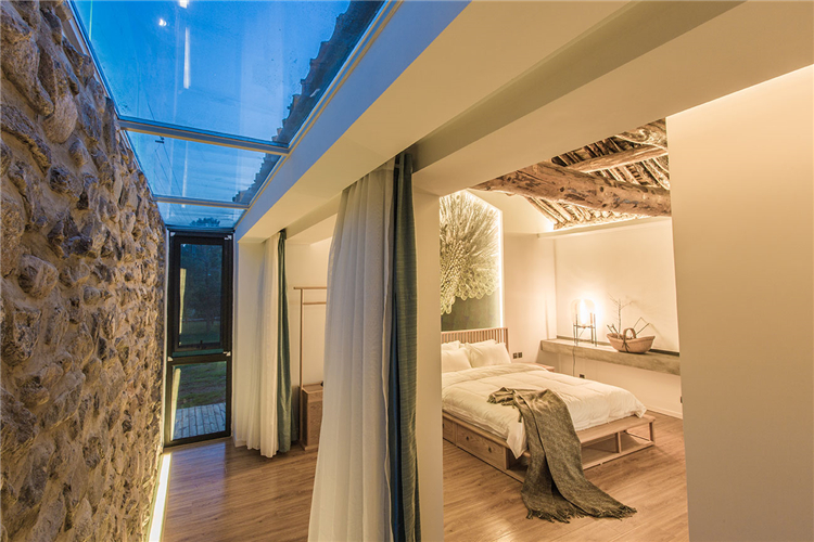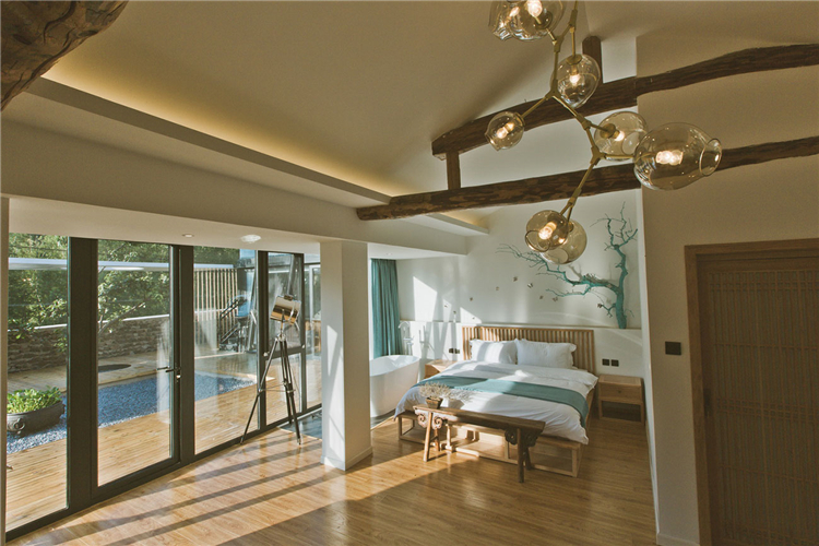 “隨著越來(lái)越快的生活節(jié)奏我們每天奔忙,每天遺忘城市越來(lái)越近,鄉(xiāng)村卻越來(lái)越遠(yuǎn)”。這所名為“畫框里”的民宿位于水泉子村,而名字寓意為將百里畫廊的山水美景留在畫中院中??煽吹矫逼鋵?shí)靈動(dòng)的山水畫這四季的變幻,凝集了我們對(duì)生活所有的向往。落地窗邊放置了浴缸做一個(gè)泡泡浴一眼望去是院落的美景和遠(yuǎn)山的意境。主臥空間很寬敞,新中式的原木配灰色的簡(jiǎn)易家具些許的現(xiàn)代元素金屬攝影燈使房間內(nèi)多一份輕松感。
