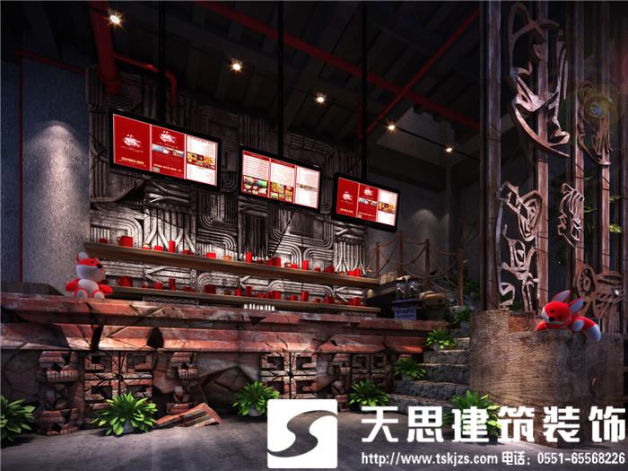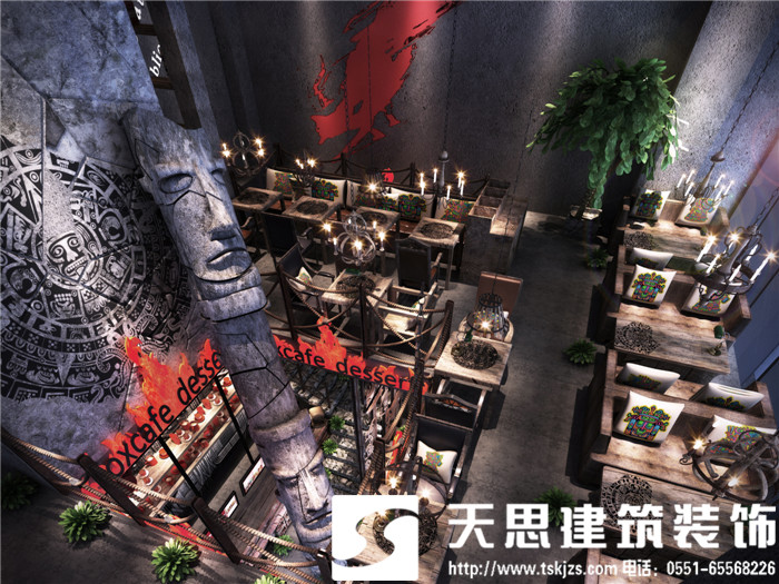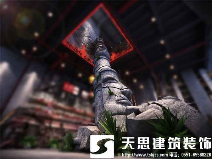 此案運(yùn)用破碎的瑪雅建筑紋理作為主元素貫穿整體空間設(shè)計(jì),將消失的瑪雅文化融入到設(shè)計(jì)風(fēng)格里,用藝術(shù)化自然化的設(shè)計(jì)手法將簡陋的空間置換為國際潮流空間設(shè)計(jì)風(fēng)尚。僅用一根從底層直穿二樓的人面雕塑就巧妙規(guī)避了空間的局促感,成為整體空間設(shè)計(jì)最凝練的一筆。整體空間基調(diào)沉穩(wěn),清水混凝土、石頭以及原木都為統(tǒng)一的暗色系,為了突出火狐的特色,將紅色引入空間,不僅活躍了空間,也讓品牌形象悄然流露。
