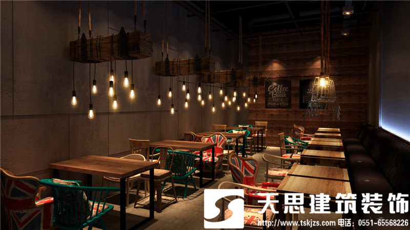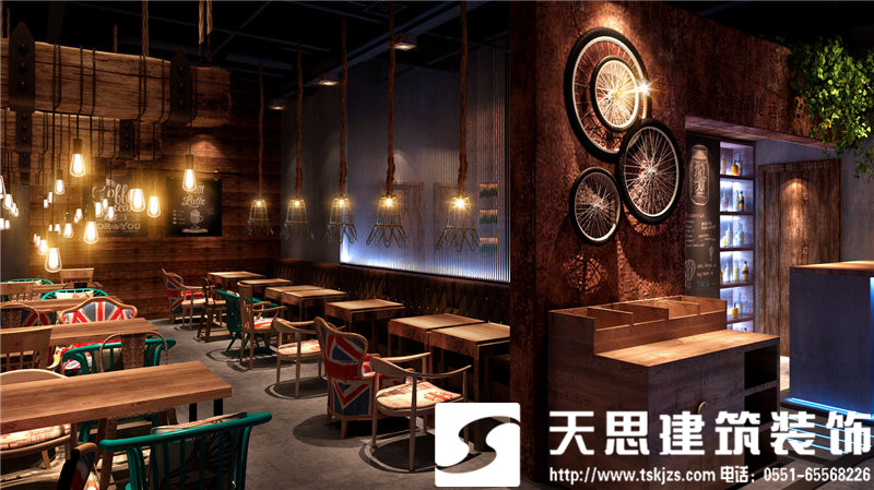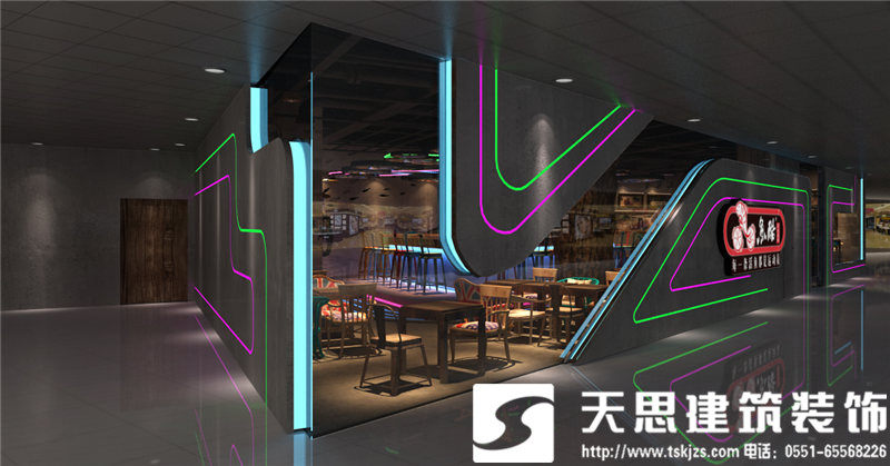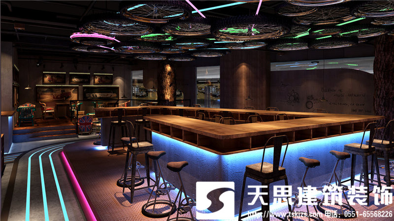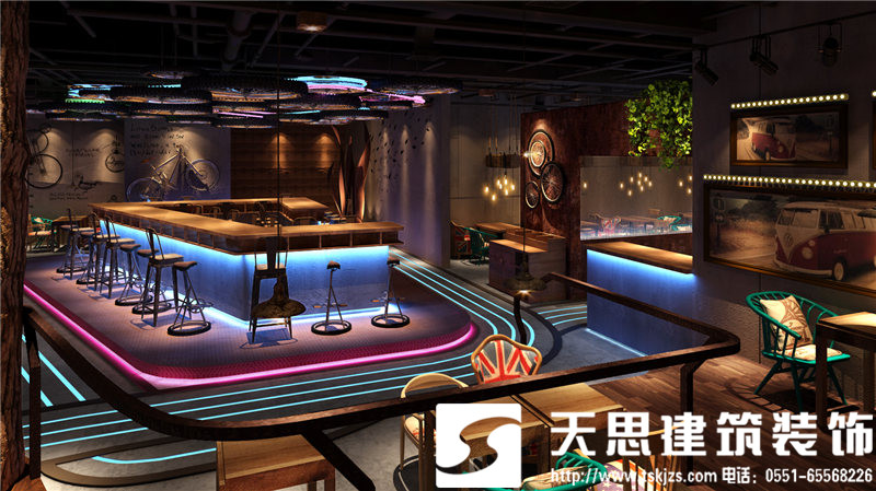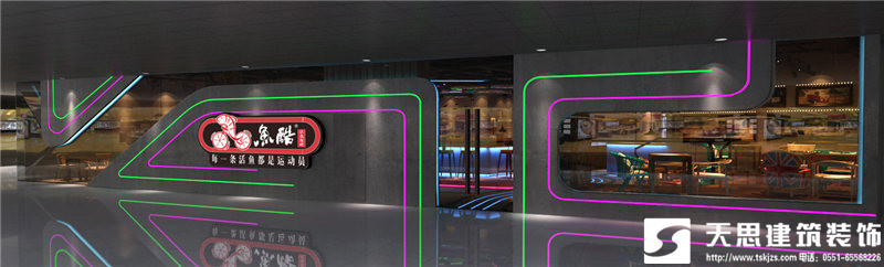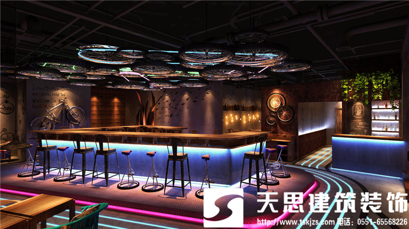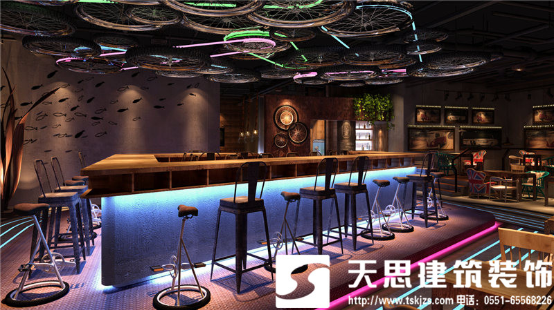 本項目的設計采用魚酷的LOGO跑道作為設計的核心點,體現(xiàn)一個“活”字,自行車輪胎為輔助增強裝飾性和動態(tài)感。魚酷,剝離了傳統(tǒng)燒烤的呆板模式,讓空間活泛而浪漫。