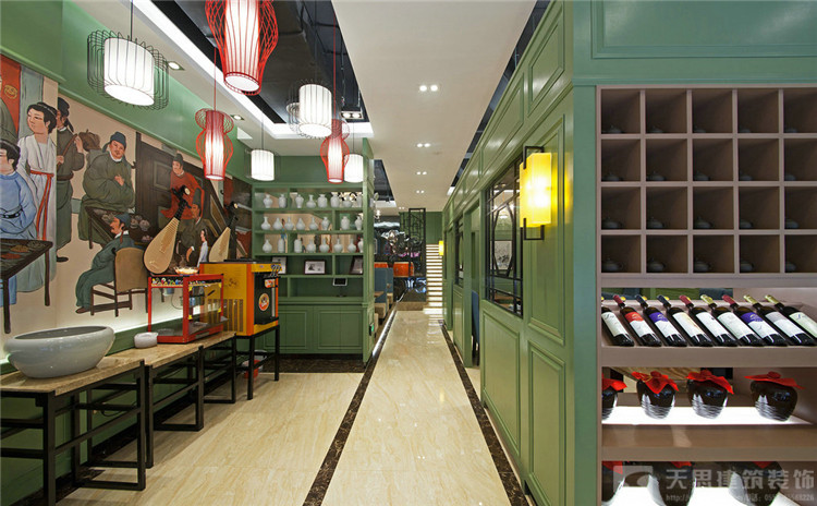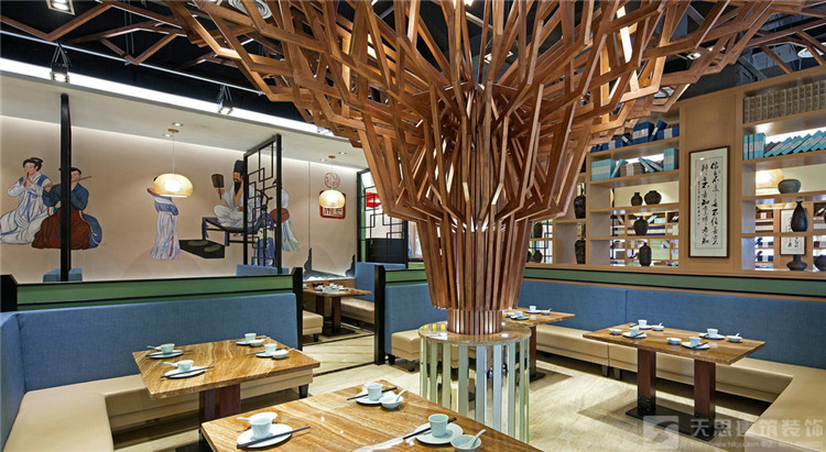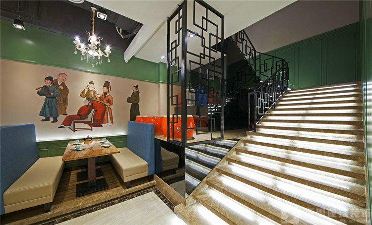 夜宴餐廳以五代十國時(shí)南唐畫家顧閎中的作品《韓熙載夜宴圖》為創(chuàng)作靈感來源,通過“聽彈琵琶”,“集體觀舞”,“中間休息”,“各自賞月”。“依依惜別”,等五個(gè)章節(jié)來還原當(dāng)時(shí)的盛況,通過畫中設(shè)計(jì)元素提煉,及色彩的組合,達(dá)到客戶用餐的體驗(yàn)感。