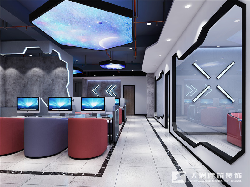 根據(jù)業(yè)主的要求,網(wǎng)咖設(shè)計(jì)的整體顏色以淺色為主,中間穿插對(duì)比強(qiáng)烈的撞色系來(lái)展現(xiàn)效果。