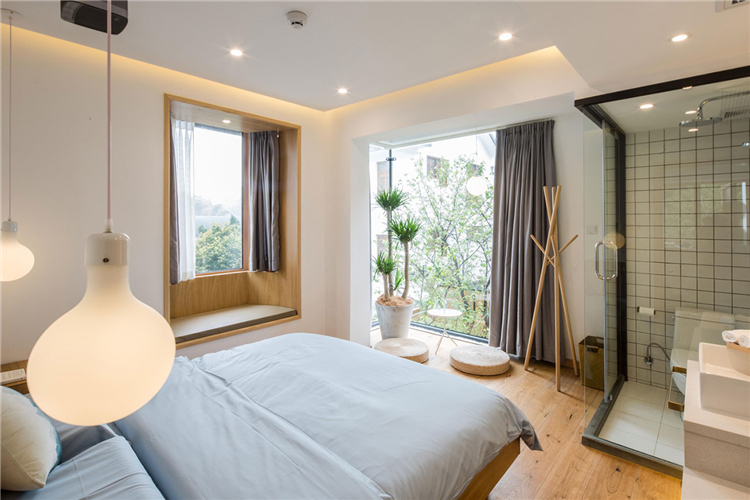 設(shè)計采用了未經(jīng)加工的天然褐色原木及灰色砌磚來營造溫馨怡人的原始氛圍,安靜、私密和精致。酒店整體現(xiàn)代禪意簡約風(fēng)格設(shè)計,深色的主基調(diào),本土粗獷肌理的石材、手工質(zhì)感的漆面、黑色系的木頭、適度的鋼架結(jié)構(gòu)、全實木的家具,配合棉麻的窗簾、羊毛的地毯、密織埃及棉的床上用品,冷峻和溫暖的相輔相成,成為一個溪流邊休養(yǎng)生息的家,隔絕繁雜城市生活的安靜避風(fēng)港。