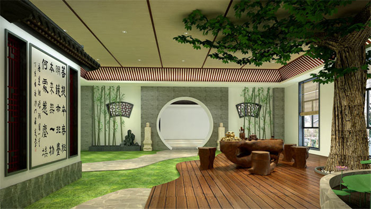 書(shū)法教育培訓(xùn)機(jī)構(gòu)庭院設(shè)計(jì):菩提本無(wú)樹(shù),明鏡亦非臺(tái),本來(lái)無(wú)一物,何處惹塵埃,四局偈語(yǔ)表現(xiàn)的即是書(shū)法也是道理,表示書(shū)法的博大精深。
