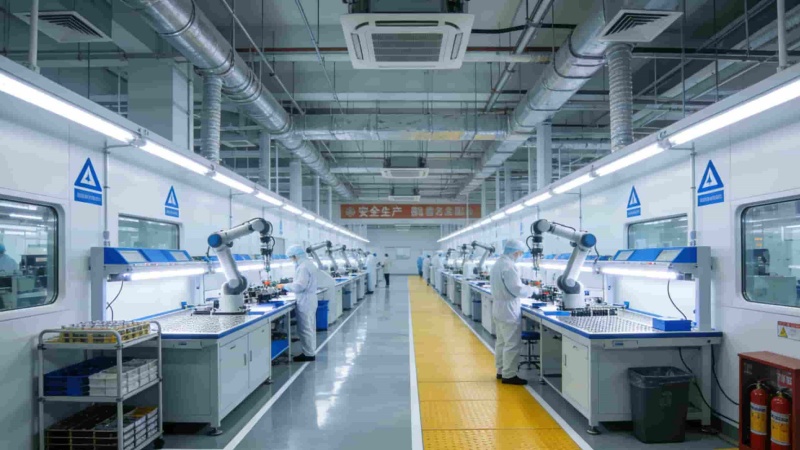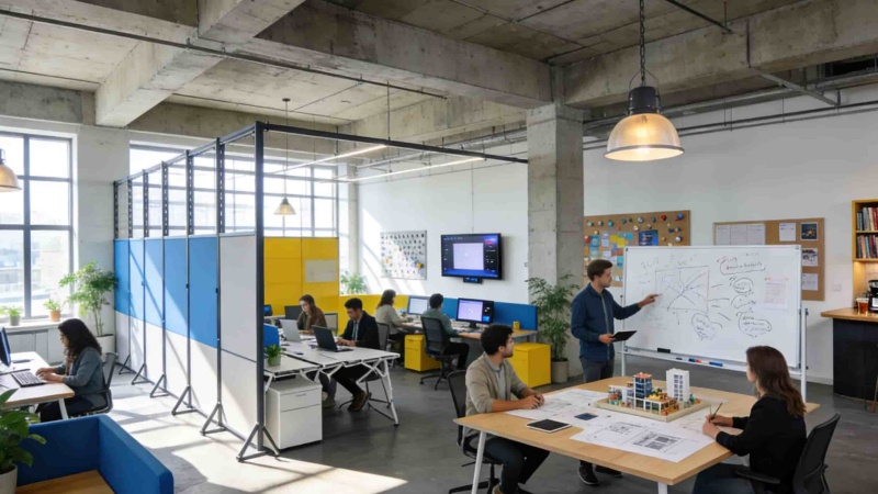 生產(chǎn)區(qū)域按需分區(qū):十萬級(jí)潔凈電子車間以灰白為主調(diào),配備自動(dòng)化流水線與防靜電系統(tǒng);重型設(shè)備組裝車間采用耐磨地坪與行車軌道,色彩對(duì)比鮮明。辦公區(qū)域兼顧協(xié)作與專注,開放式卡位、創(chuàng)意辦公區(qū)與研發(fā)專注艙合理布局,裸頂工藝、原木元素與綠植點(diǎn)綴,平衡工業(yè)感與舒適度。