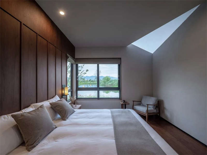 兩個(gè)客房的室內(nèi)格局不太相同,其中一個(gè)戶型是室內(nèi)空間非常緊湊的,而室外則有一個(gè)非常大的露臺(tái),室內(nèi)只是滿足基本的居住需求,大部分時(shí)間可以在戶外感受自然,靜賞湖光山色。形態(tài)關(guān)系上兩片大的三角雙坡屋頂蓋住了整個(gè)房間,屋頂呈一頭起翹狀態(tài),立面全玻璃通透,而大屋蓋又限定了室內(nèi)看出去的視野范圍和方向。室內(nèi)空間由中間的衛(wèi)生間一分為二,分為了睡眠區(qū)和休閑區(qū),空間左右對(duì)稱,中間衛(wèi)生間體量不到頂,整個(gè)屋頂空間連續(xù)可見。大露臺(tái)上設(shè)置了一個(gè)休閑喝茶區(qū)和戶外泡澡浴缸,臨水設(shè)計(jì)了無框玻璃欄板讓視線盡量少的被遮擋。