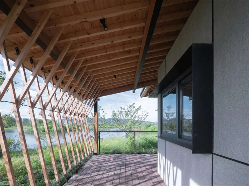 濕地生態(tài)酒店由兩個(gè)客房類型有機(jī)打散分布組成,都是運(yùn)用了在大屋頂下生活的概念,大屋頂也像是翅膀,如小鳥般棲居于此,在島上停留片刻,輕輕落在水面上。古人造物很喜歡因地制宜,輕巧的介入自然,用木頭把房子架在水上,房子被自然融入與包裹,這種生態(tài)觀念在中國人的骨子里就一直存在。很多人會(huì)說這兩個(gè)房子很有江南的味道,這種江南性一方面在于對(duì)房子虛體空間屬性的理解,放大檐下空間的比例,連接人居空間與自然天地,同時(shí)通過對(duì)尺度的把握創(chuàng)造怡人的居住空間,皆是營造一種人、空間、自然三者之間的關(guān)系。