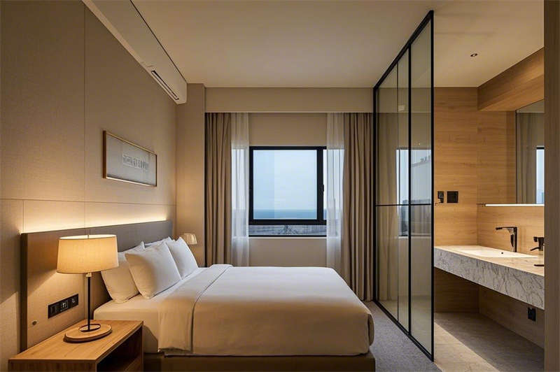 客房設計延續(xù)了現(xiàn)代簡約的風格,淺木色與灰色的主色調(diào)搭配,營造出寧靜而舒適的居住環(huán)境。寬敞的落地窗將城市美景盡收眼底,智能燈光系統(tǒng)與電動窗簾為您提供便捷的入住體驗。干濕分離的衛(wèi)生間采用大理石臺面與玻璃隔斷,既實用又彰顯品質(zhì),讓您在繁忙的旅途中也能享受片刻的放松。