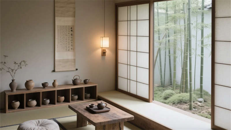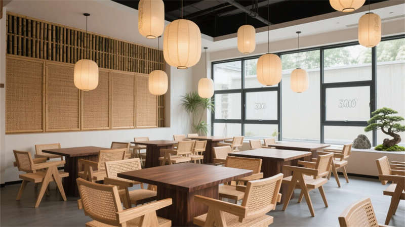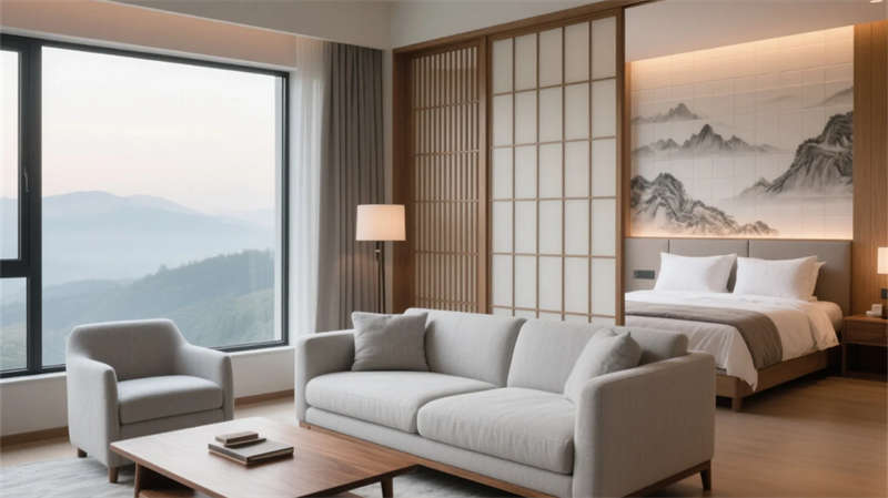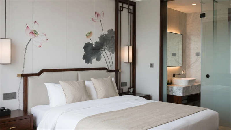 大堂以格柵天花與山水背景墻定調(diào),光影交錯間傳遞寧靜力量。餐廳借竹編與紙燈演繹傳統(tǒng)匠心,窗外庭院景觀延伸視覺層次??头哭饤壏睆?fù)裝飾,棉麻材質(zhì)與低飽和度色彩引導(dǎo)深度放松,套房通過屏風(fēng)巧妙劃分動靜區(qū)域。茶室以博古架和宣紙屏風(fēng)構(gòu)筑禪修意境,而庭院花園的枯山水與竹影,則成為自然與建筑的共生隱喻。