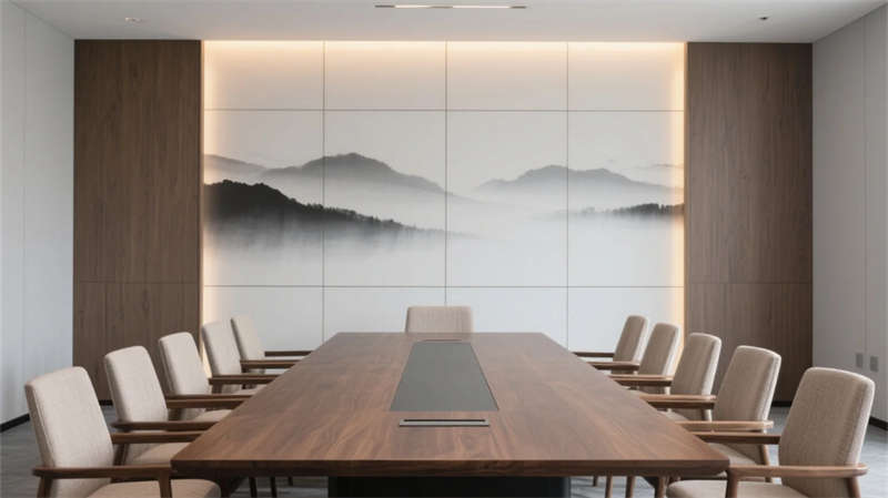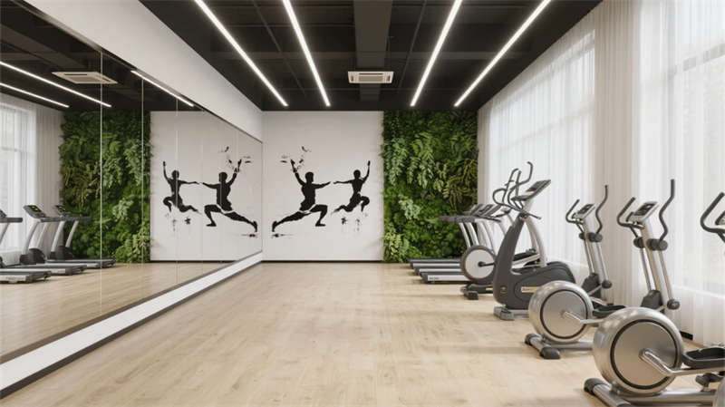 健身區(qū)與會議室平衡功能與美學(xué),金屬器械融入水墨肌理,會議長桌呼應(yīng)胡桃木的溫潤質(zhì)感。整體設(shè)計弱化邊界,讓光、影、材質(zhì)在流動中對話,為合肥注入一處隱于城市的東方精神綠洲。