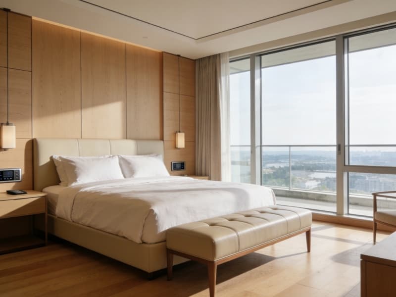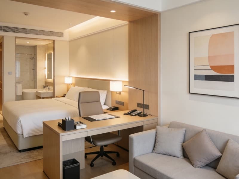 二至四層為住宿層,規(guī)劃約80間客房,包括豪華房、行政房等房型??头恳詼\木色為主調(diào),搭配真皮軟裝與柔和燈光,營(yíng)造溫馨氛圍。每間客房均配備智能客控系統(tǒng),方便客人操作。