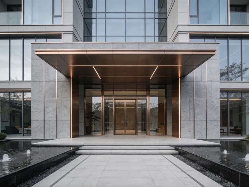 本設(shè)計(jì)秉持“簡(jiǎn)約輕奢,旅居雅境”的理念,為4000平酒店打造高品質(zhì)空間。外觀采用淺灰色石材與通透玻璃搭配,輔以金屬線條勾勒,簡(jiǎn)潔大氣又具時(shí)尚感。入口設(shè)挑高門廊,搭配旋轉(zhuǎn)門與迎賓水景,營(yíng)造出尊崇的入戶體驗(yàn)。