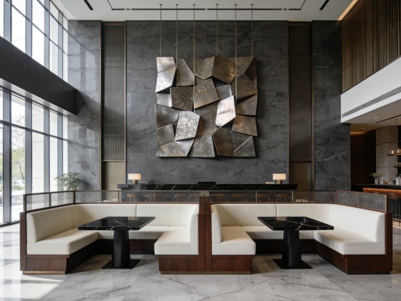 酒店一層為公共區(qū)域,大堂地面鋪淺灰色大理石,前臺(tái)背景墻以巖板結(jié)合藝術(shù)裝置,彰顯格調(diào)。大堂吧設(shè)半私密卡座,供客人休憩交流。全日制餐廳配備開放式廚房,可讓客人直觀感受美食制作過程。