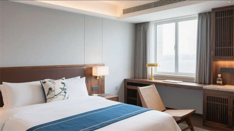步入大堂,深胡桃木墻面與淺灰石材地面構(gòu)成經(jīng)典東方底色,水墨藝術(shù)玻璃屏風(fēng)似山巒疊嶂,懸浮竹編吊燈以編織肌理軟化空間。靛藍(lán)色沙發(fā)與黃銅細(xì)節(jié)的點(diǎn)綴,既延續(xù)外立面色彩邏輯,又激活視覺層次。餐飲空間延續(xù)木格柵語言,竹編燈罩與黑陶器皿在開放式廚房的金屬框架中碰撞,演繹“新舊共生”的餐飲儀式。