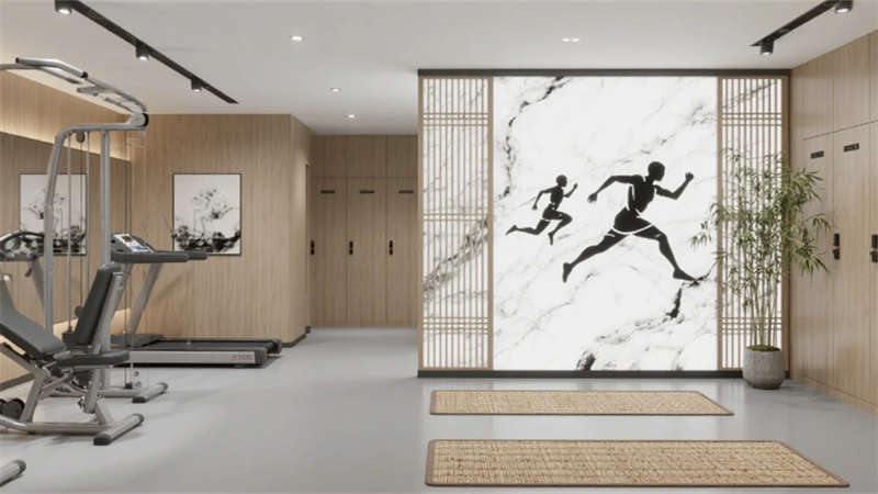 客房區(qū)域以“去符號(hào)化”手法詮釋東方美學(xué):深木紋床頭背板嵌入隱晦的水墨紋樣,藤編躺椅與迷你吧木格柵柜體,在3000K暖光中營(yíng)造居停的松弛感。套房通過絲絨沙發(fā)與抽象水墨畫提升奢華調(diào)性,浴缸區(qū)的竹藝卷簾巧妙平衡通透與私密。公共空間亦貫徹統(tǒng)一語匯——健身房竹編地墊與水墨運(yùn)動(dòng)壁畫、走廊絹絲燈箱與枯山水景墻,皆以現(xiàn)代材質(zhì)轉(zhuǎn)譯傳統(tǒng)元素。