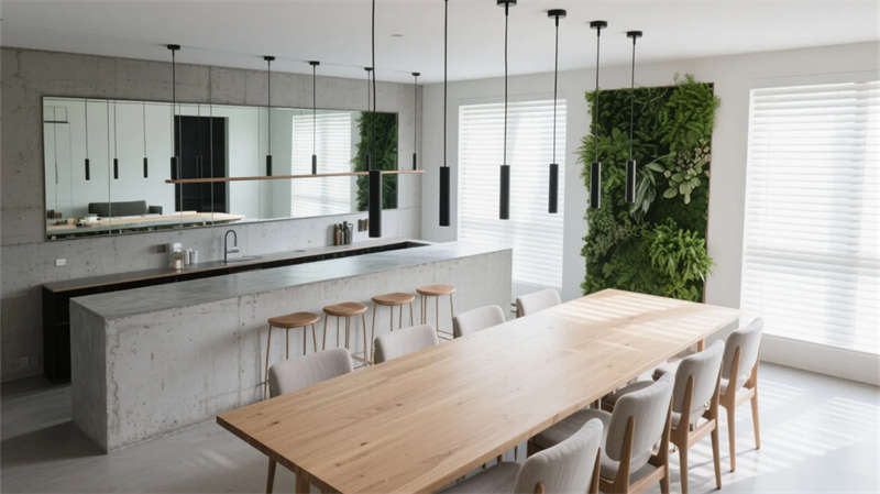 庭院成為生態(tài)樞紐,幾何水景倒映建筑體塊,耐旱植物與灰石板構(gòu)成低維護景觀。多功能廳通過靈活隔斷適應(yīng)共享需求,藝術(shù)品陳列架隨動線旋轉(zhuǎn)生趣。整體摒棄繁復(fù)裝飾,用材質(zhì)本真觸感、光影時間軌跡與城市山水意境,營造大隱于市的當(dāng)代棲居范本。