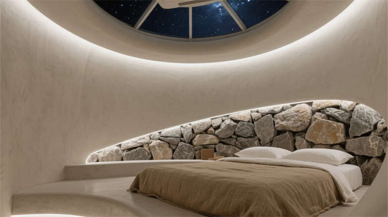 功能布局巧妙銜接室內(nèi)外呼吸感:接待廳玻璃幕墻引竹林入畫,禪茶室借枯山水凝神靜氣;餐廳與書吧以可移動家具實現(xiàn)場景轉(zhuǎn)換,暗藏式光源在夜間描摹空間輪廓??头吭O(shè)計強調(diào)私密療愈,星空穹頂與混凝土浴缸形成原始與現(xiàn)代的詩意碰撞。