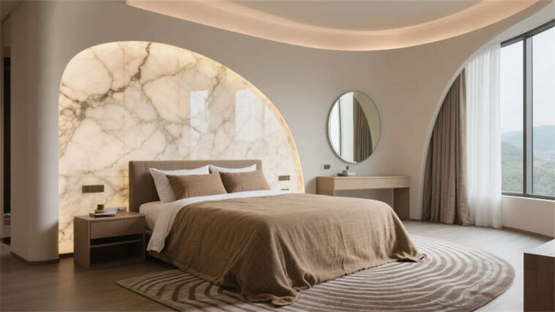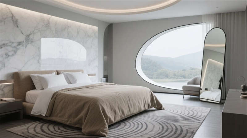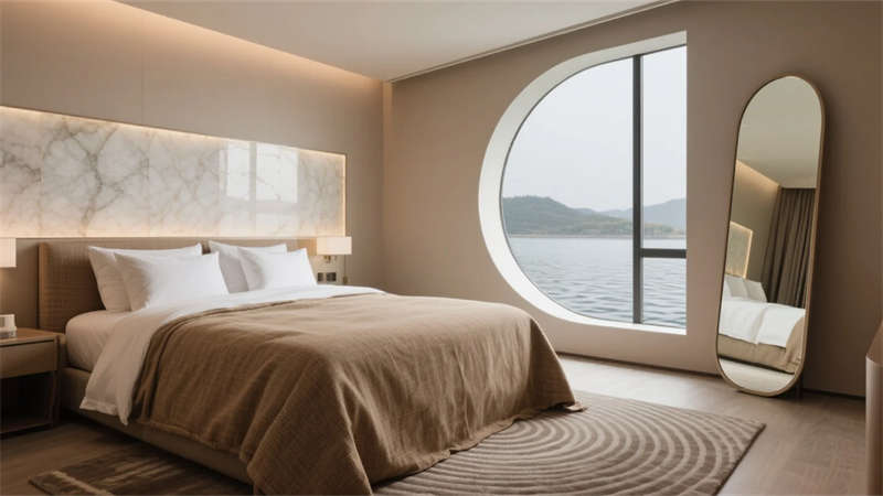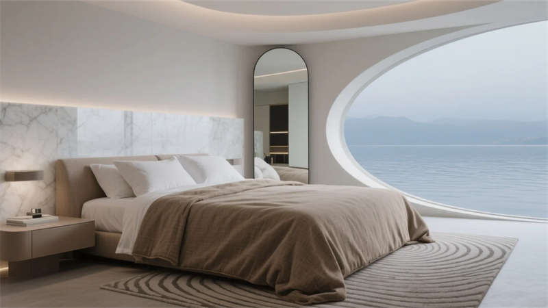 每一處細節(jié)皆成藝術(shù)現(xiàn)場——走廊夯土墻鐫刻時光肌理,發(fā)光地磚指引探索路徑;臥室弧形鏡面折射虛實,讓人沉入湖居夢境。這里不僅是棲居之所,更是一場喚醒感官的在地美學巡禮,讓合肥的湖韻林語,成為流淌于日常的奢享印記。