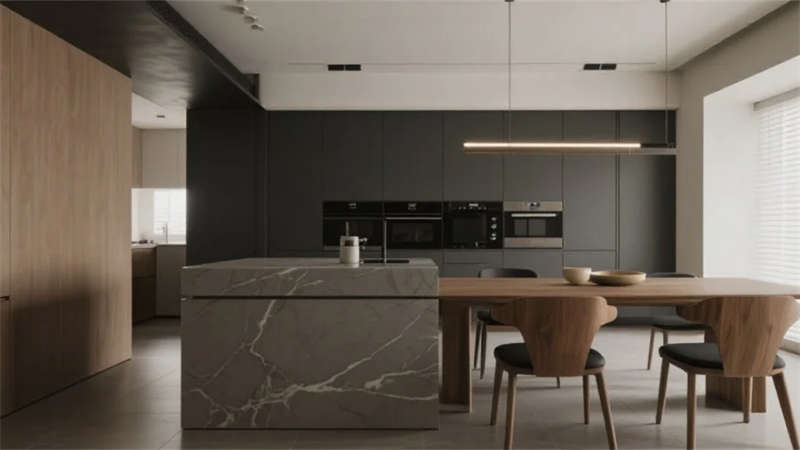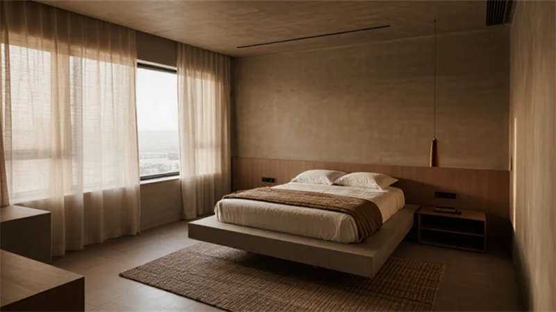 空間布局強(qiáng)調(diào)流動(dòng)性與光影互動(dòng),落地窗成為連接內(nèi)外的畫框,將庭院竹影、城市天際線轉(zhuǎn)化為動(dòng)態(tài)藝術(shù)裝置。無(wú)主燈設(shè)計(jì)搭配隱藏式照明系統(tǒng),在夜間暈染出柔和的光韻層次。衛(wèi)浴空間以灰調(diào)水磨石營(yíng)造靜謐感,獨(dú)立浴缸臨窗而設(shè),沐浴時(shí)可見(jiàn)星月交輝。