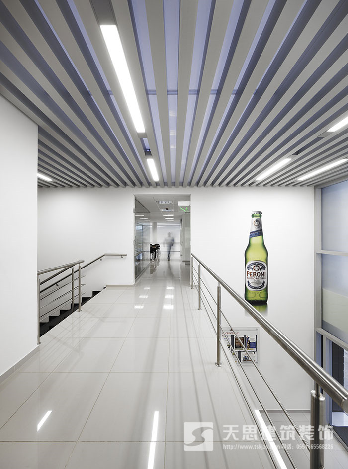 過道好似云梯,潔白的空間給人一種別樣的感覺,讓空間不在單調,大大的啤酒瓶鑲嵌在空間的白墻上,既做為點綴,同時也作為企業(yè)的品牌宣傳。