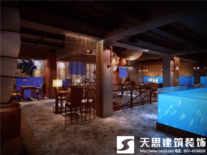 銅須水族主題會所,空間造型大氣磅礴,初入室內(nèi)即被粗獷自然的設(shè)計所震撼。給人一種無限擴張的空間力量??臻g材料和色彩的運用細膩而大膽,情節(jié)化的場景布置與戲劇性的張力設(shè)計營造出豐富的視覺享受。