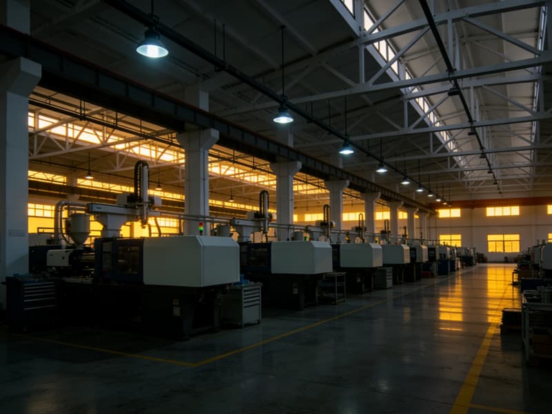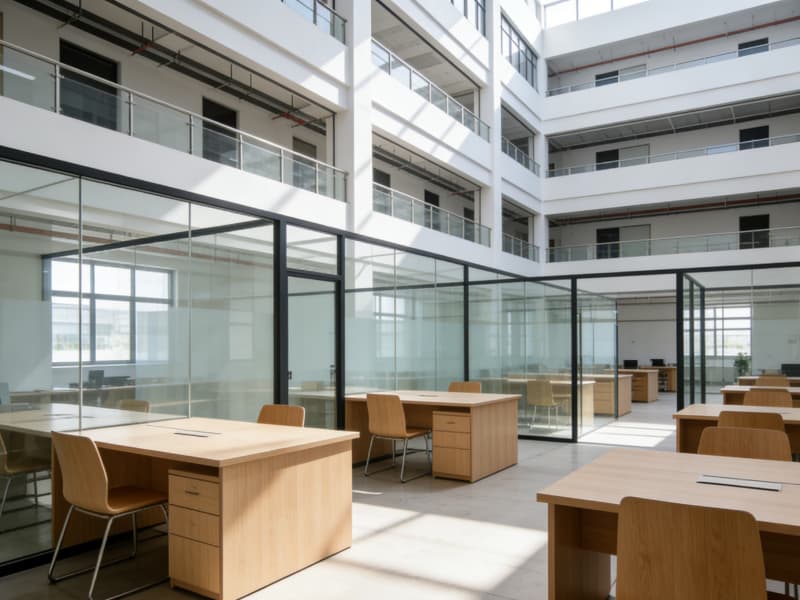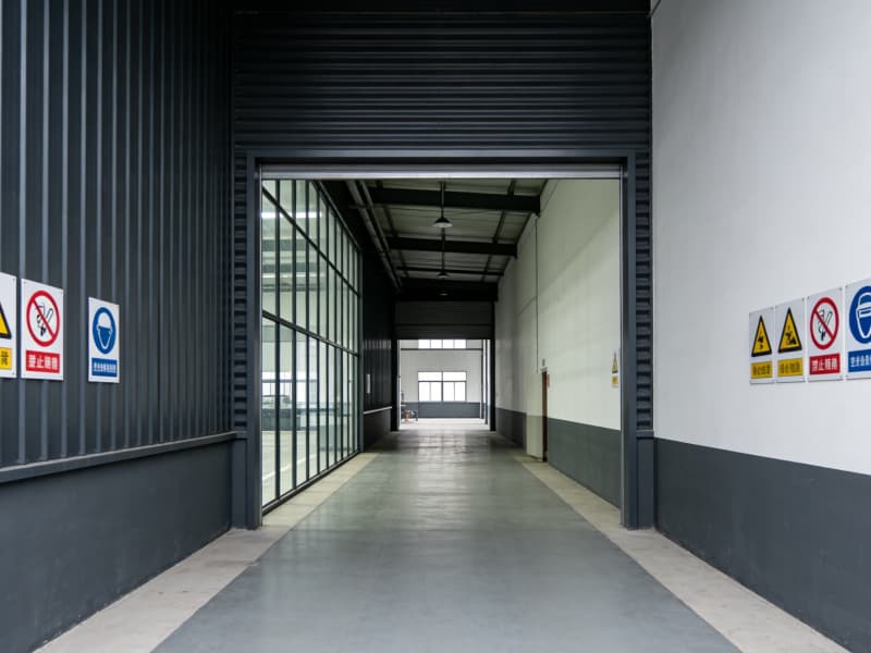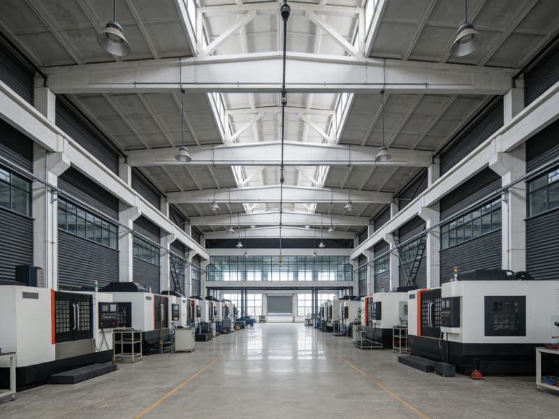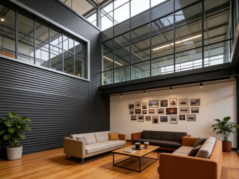 進(jìn)入廠房內(nèi)部,生產(chǎn)區(qū)域挑高設(shè)計,空間開闊,頂部的桁架結(jié)構(gòu)裸露在外,搭配軌道式吊燈,營造出強(qiáng)烈的工業(yè)氛圍。地面選用耐磨的金剛砂地坪,承載能力強(qiáng)且便于清潔,滿足高強(qiáng)度生產(chǎn)需求。